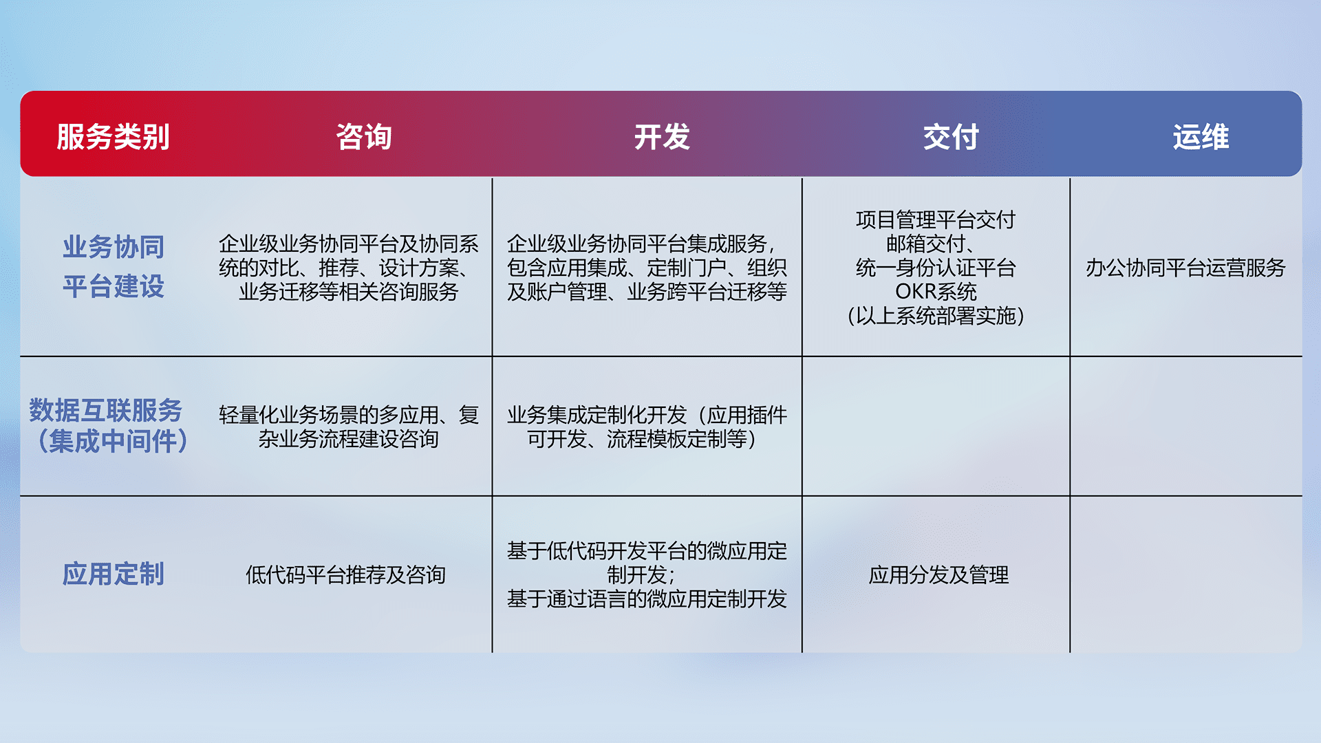 针对钉钉、、、企微、、IDaas等平台级产品提供产品的规划、、、、方案、、、、交付、、、定制化开发等服务,,,,实现如统一协同办公、、、、智能客户服务、、、混合会议管理、、、智能数据查询、、、等业务场景,,,,实现数字化转型。。。
